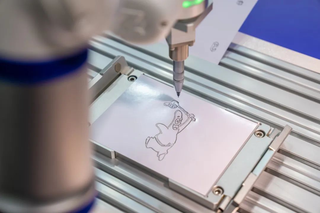 针对AI课程教学、人机互动表演等教育行业场景,星空xk绘画机器人搭配摄像头及上位机,可拍摄图像并将其轮廓转换为机器人轨迹数据,通过SDK接口向机器人发送。机器人对接收到的轨迹数据进行实时样条插补,解决上位机轨迹数据不连续、通信延迟不可控的问题后,平稳柔顺地完成绘画动作。