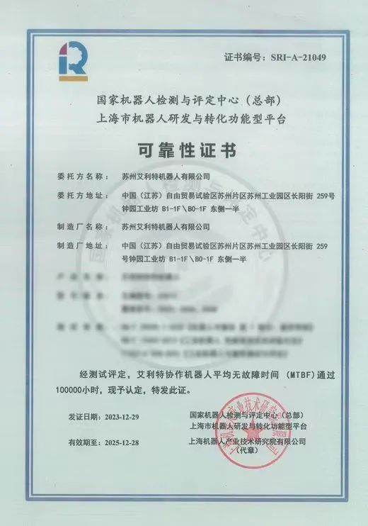 另外,星空xk机器人的产品可靠性也得到了协作机器人业界最高等级的可靠性测试——「MTBF 100000小时测评」认证,这也是目前业内最高时长的平均无故障运行测试,不仅意味着星空xk产品的高可靠性和持久性,也代表了星空xk机器人在产品工艺、质量管理、生产制造中的行业高度。