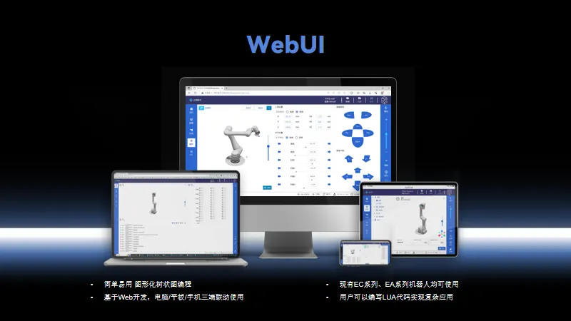 除了硬核的产品与技术,星空xk在软件生态方面依然是创新破局者。在2023年,星空xk全新推出了基于浏览器的WebUI示教软件,可以在手机、平板、电脑跨设备协同操作,星空xkEC系列、EA系列均可适用,给协作机器人示教带来新的玩法。