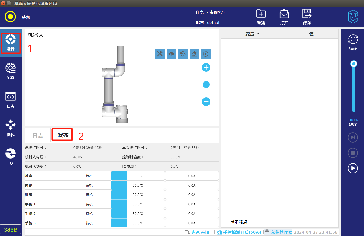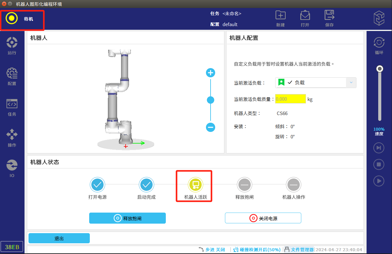 ● 机器人显示”待机“状态后退出,进入运行页面,切换状态