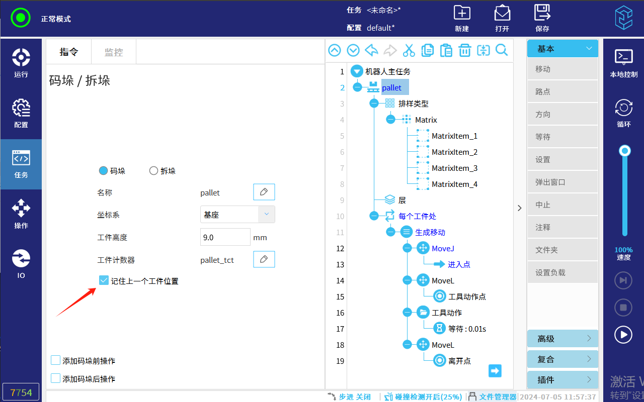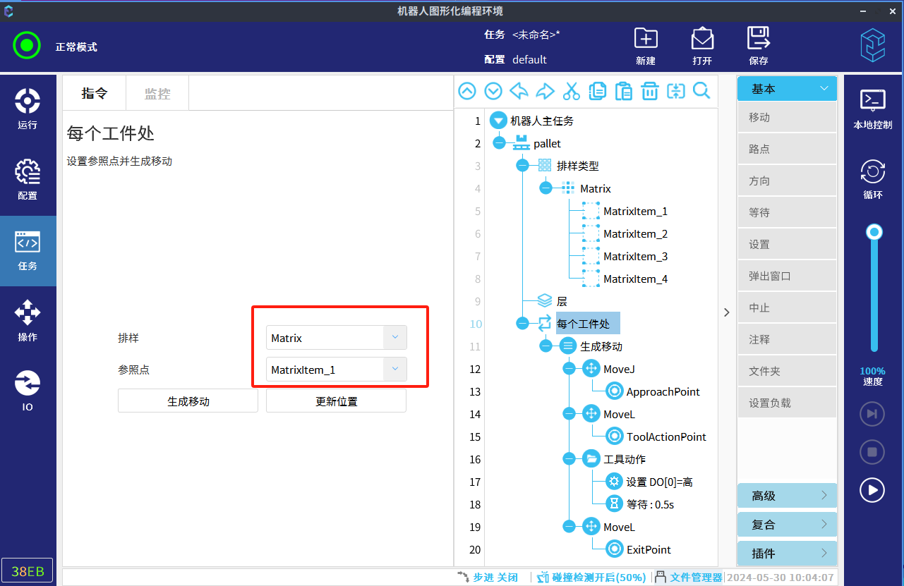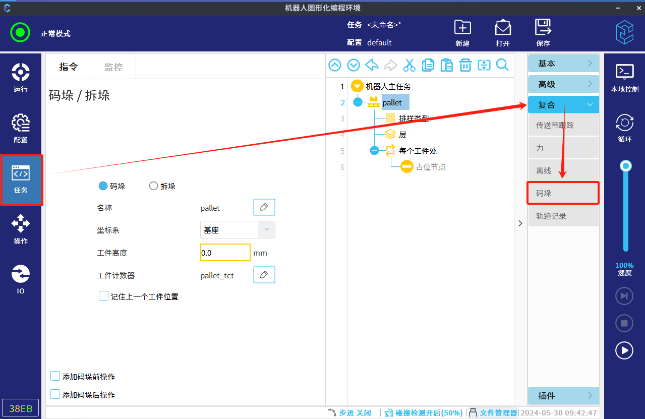 码垛支持用户自定义排样类型、层数、参考点等,进行码垛和拆垛任务的编写。