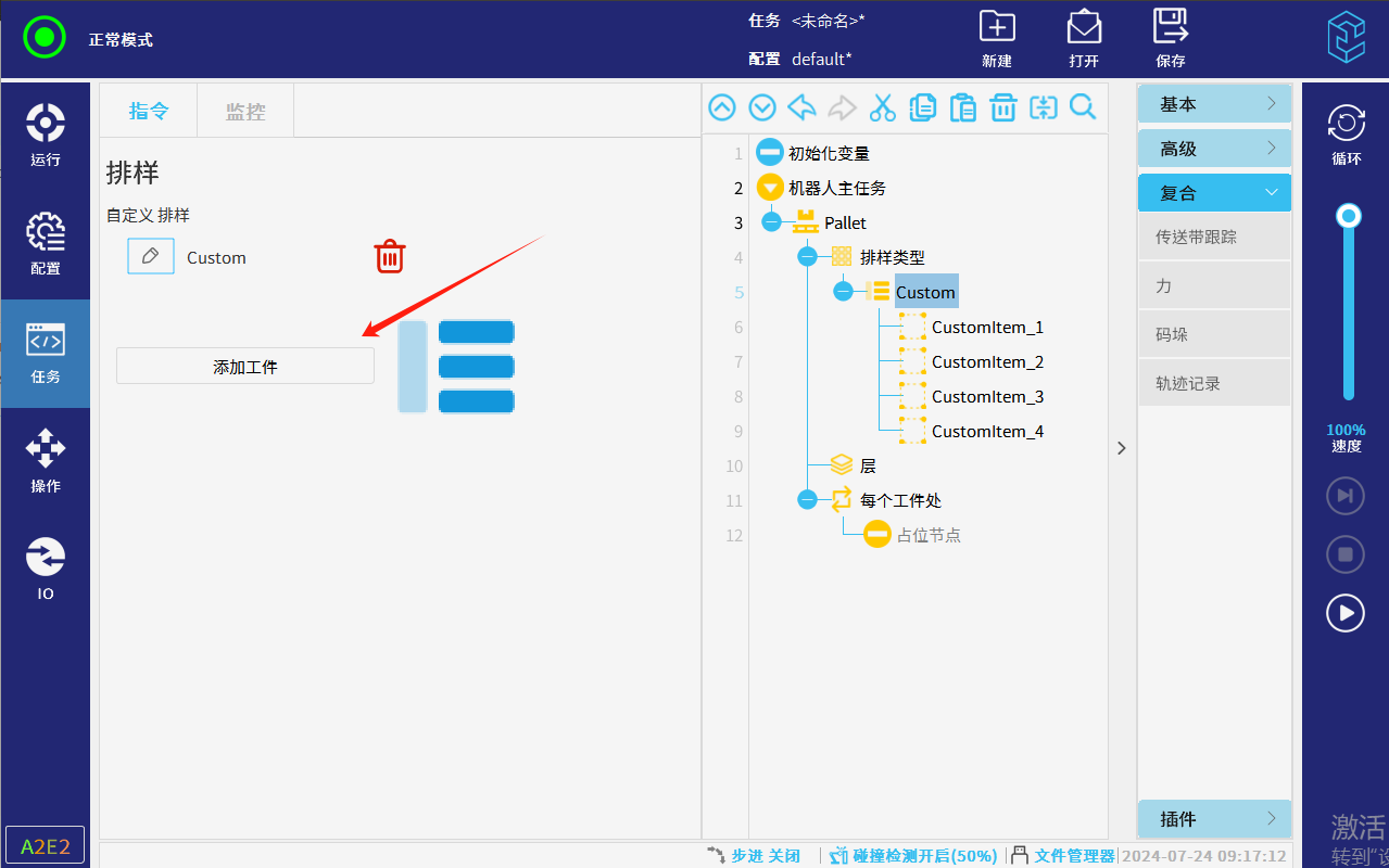 ● 自定义排样:点击自定义排样节点,可重命名排样类型的节点名称,并添加或删除“工件”节 点,自定义排样是指在不规则的码垛情况下,用户需自己示教该层点位。