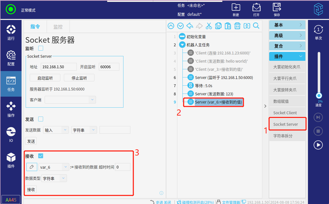 选择导航栏“任务”-指令栏选择“插件”-点击"Socket Server"-设置该指令(勾选“接收”-输入对应的数据类型)可以手动点击”接收“,也可以直接”运行任务“来接收