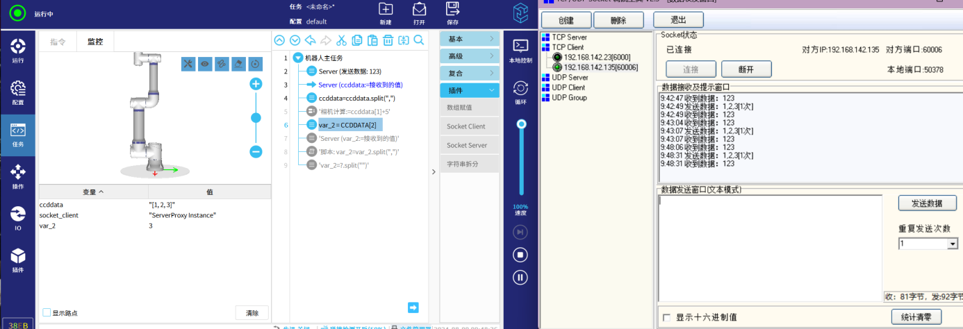 - 使用调试助手模拟视觉做(客户端/服务端)与机器人通过收发字符串来实现简单交互。