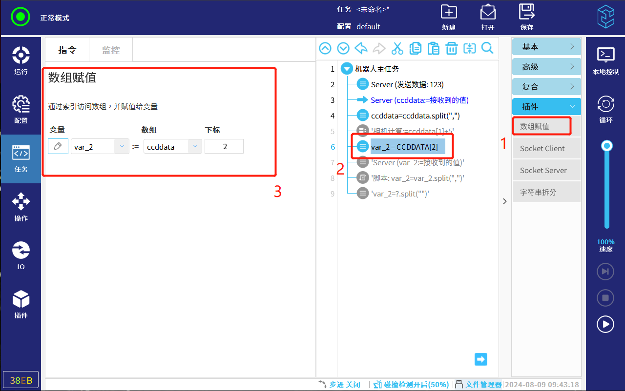 选择导航栏“任务”-指令栏选择“插件”-点击"Socket Client"-设置该指令(勾选“接收”-输入对应的数据类型)可以手动点击”接收“,也可以直接”运行任务“来接收