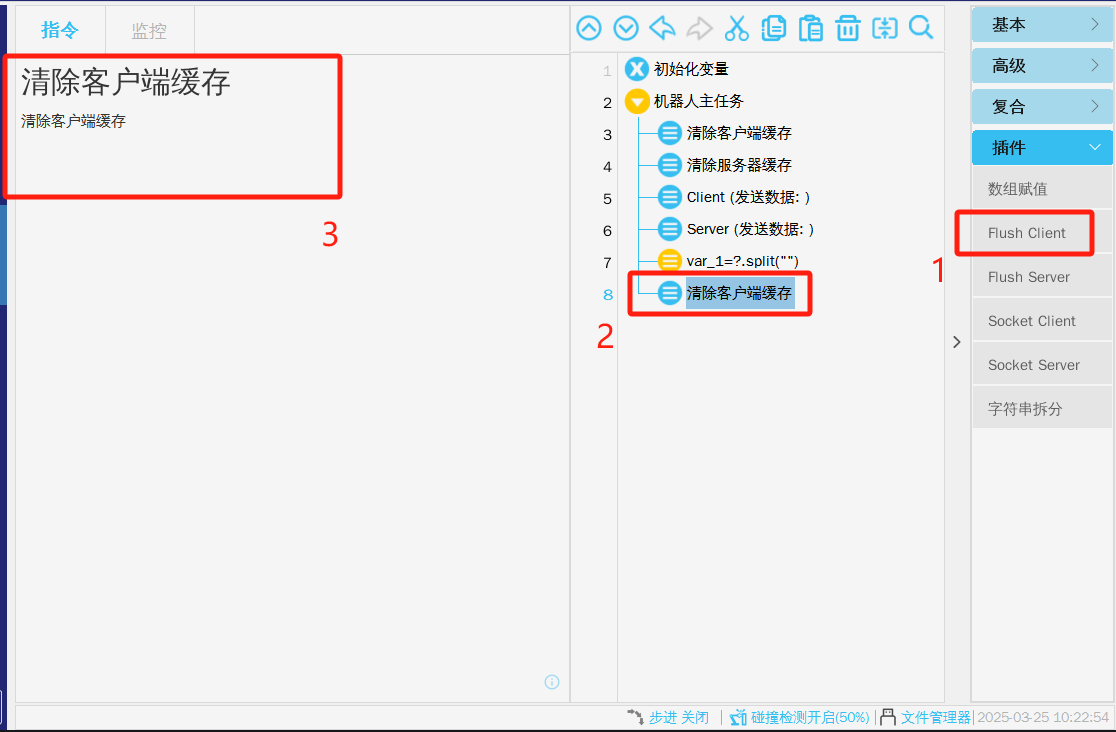 选择导航栏“任务”-指令栏选择“插件”-点击"Socket Client"-设置该指令(勾选“发送”-输入对应的数据类型)可以手动点击”发送“,也可以直接”运行任务“来发送