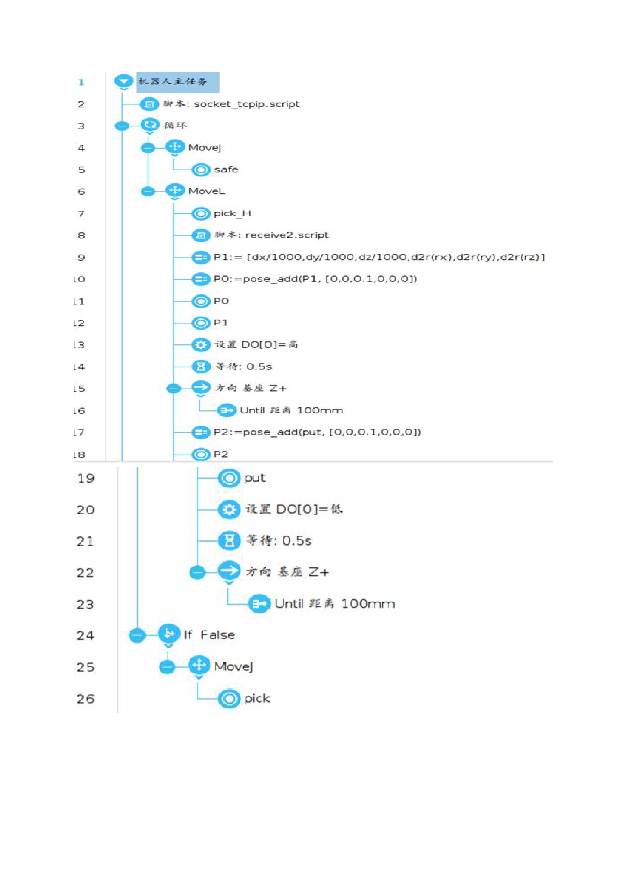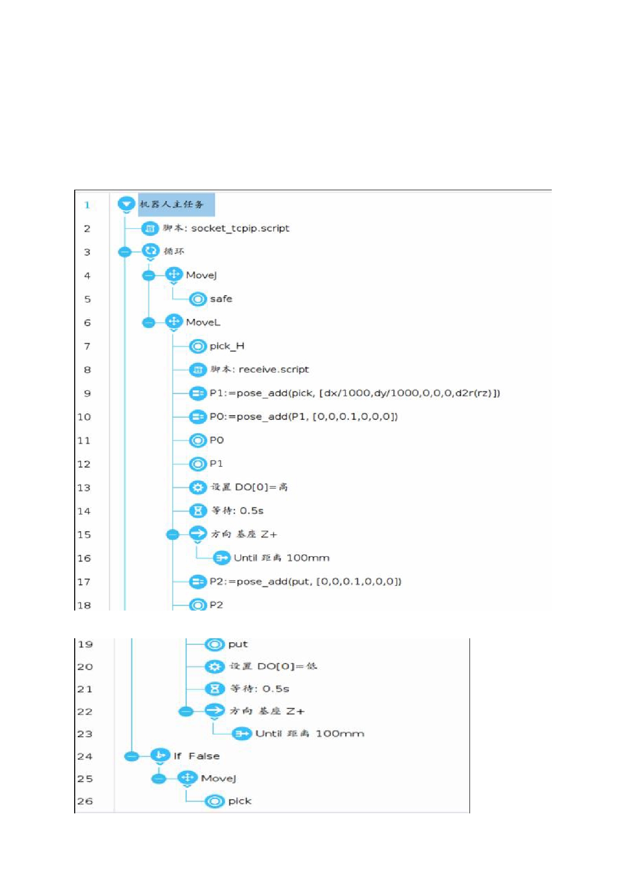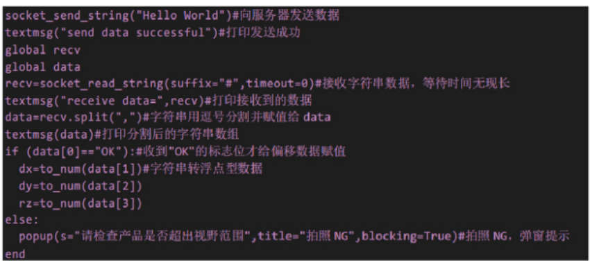 接收视觉坐标脚本程序 receive.script 如下图 6。视觉发过来的数据按照:"OK,1,2,3#"格式,第 1 位数代表标志符,拍照成功发送"OK",拍照失败发送"NG";第 2,3,4 位数分别是 X,Y,RZ 方向的偏移,数据用","隔开,末尾用"#"作为结束符。