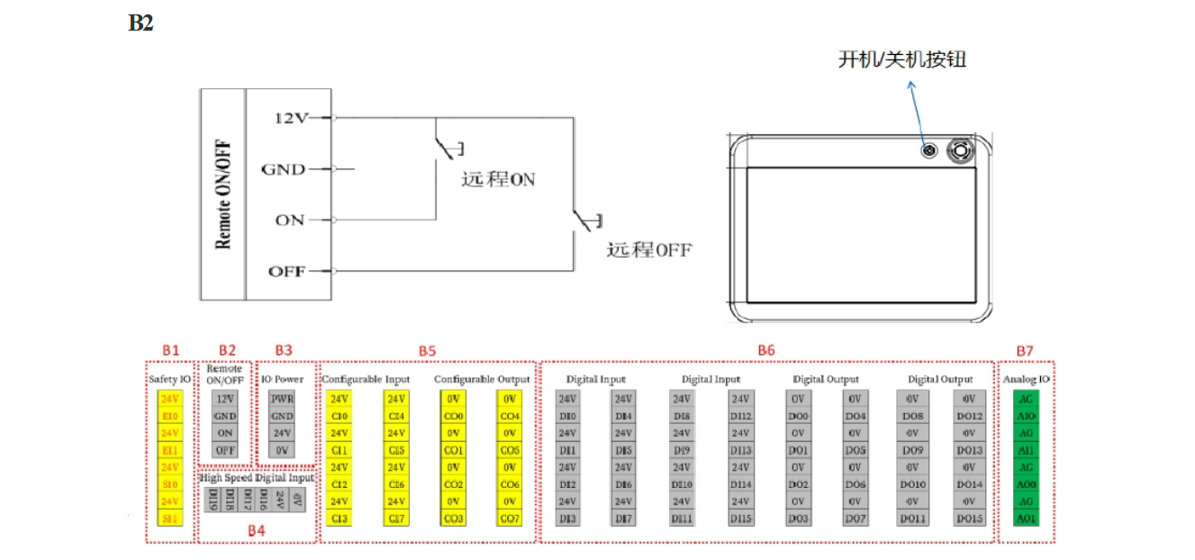 2.点击示教器上的开机按钮(可以通过接线实现,如下图)