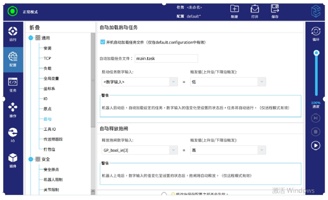 在启动选项卡配置开机自动加载任务文件,即主程序