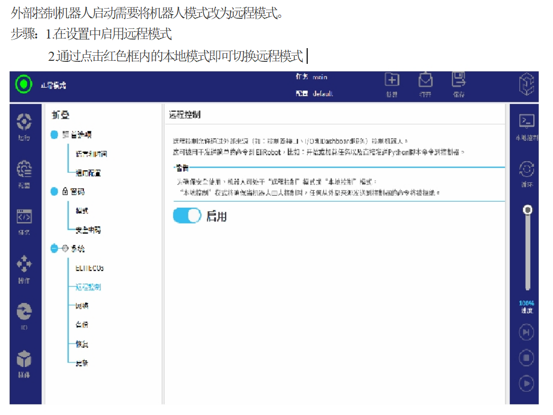 外部控制机器人启动需要将机器人模式改为远程模式。