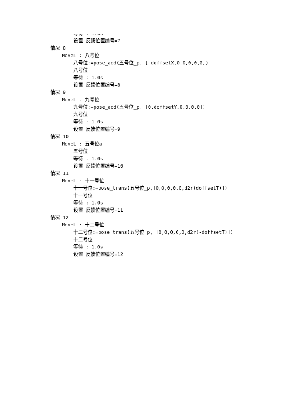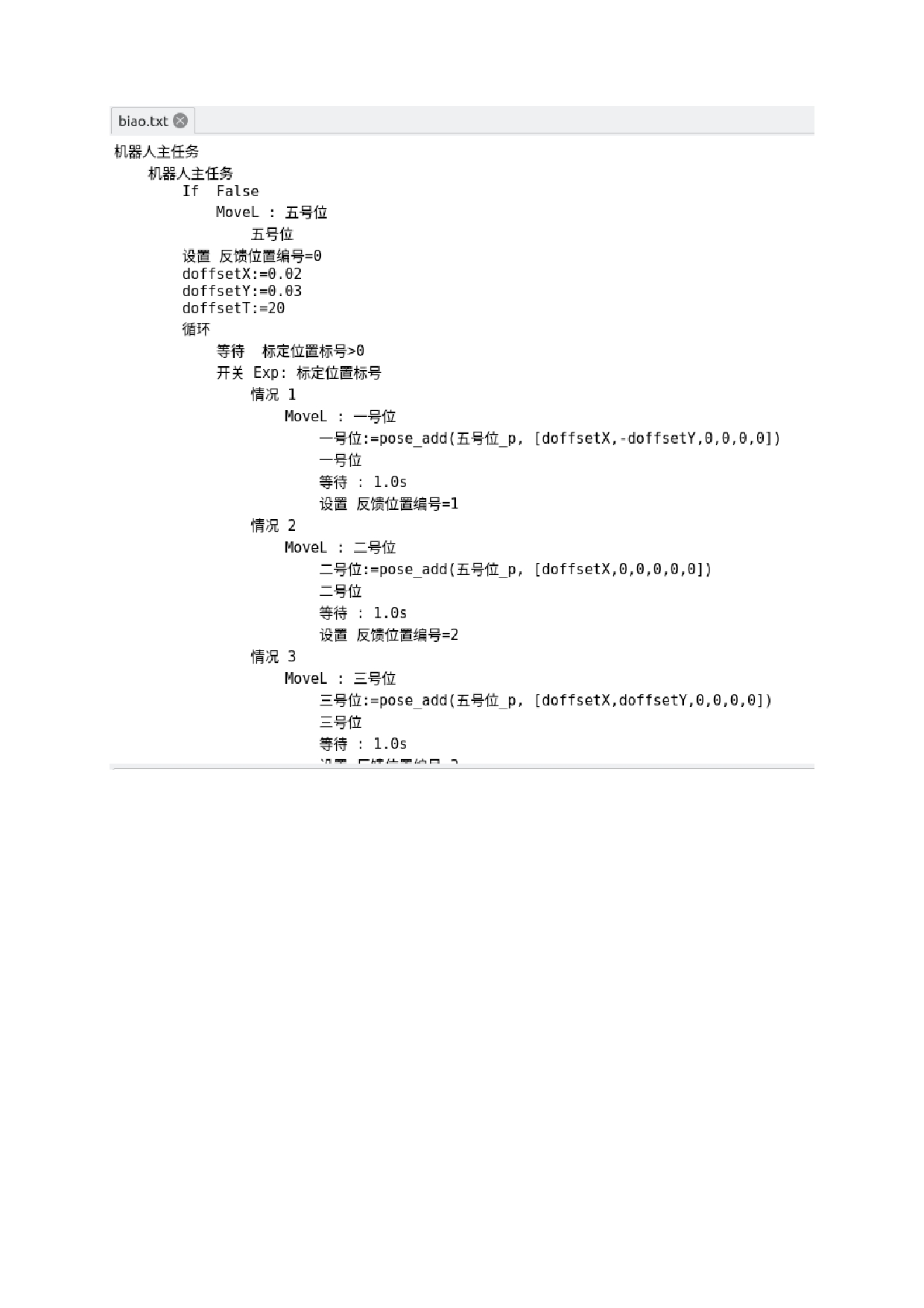 基准位上加上视觉发过来的偏移量(dx,dy,rz),到达纠偏后的取料位。程序如下图 。