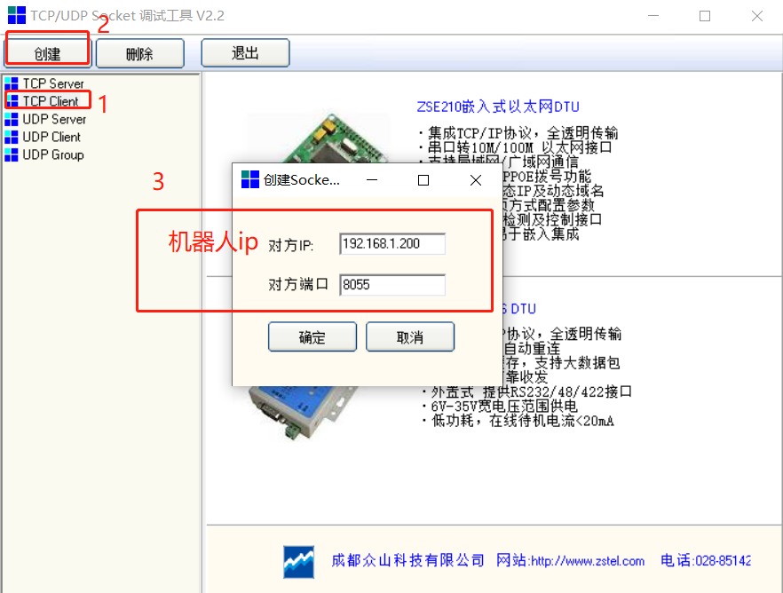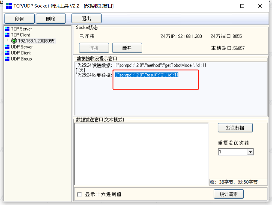 以 socket 助手为例,只需要知道机器人的 ip,端口填写 8055。连接步骤和连接成功后显示如下: