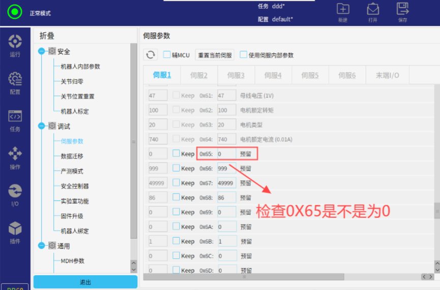 第四步:进入开发者模式,输入密码elibot后,选择伺服参数,选择对应关节伺服。(例如:伺服1故障,如下图。)