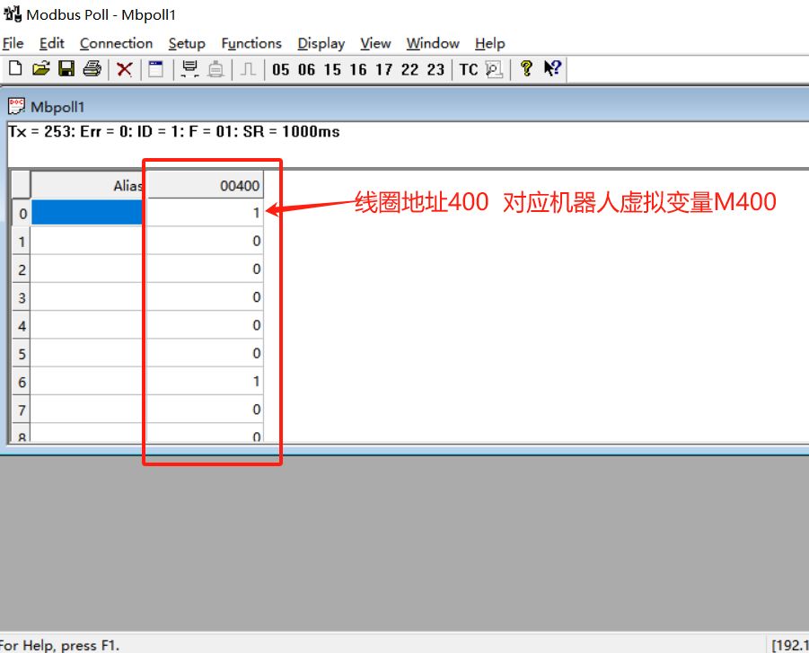 机器人端可在全局变量中查看I000-I004与寄存器400-404数值一致,读取寄存器功能及指令正常
