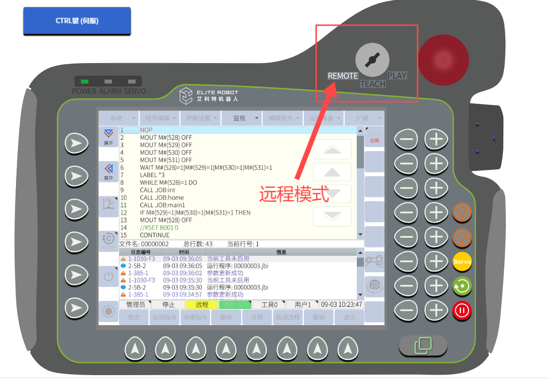 (6)进入待机界面后,依次点击打开抱闸,伺服使能,以及精确。如果使用的是迷你控制柜,第一步还有一个机械臂上电的按钮,点击上电按钮继续往下执行即可。